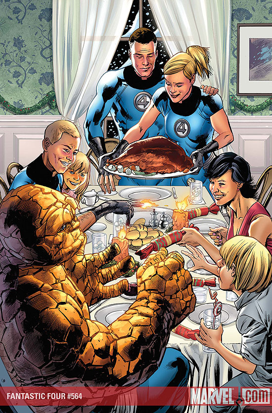 Décidément ma réconciliation avec Cap n'est par pour tout de suite, vous l'aurez compris ce Captain America #47 n'est pas fameux l'intrigue est quasi inintéressante, on se tape encore du soldat de l'hiver, la place de Namor et de la veuve noir dans l'histoire est mal géré etc ... Trop de défauts qui font que ces 22 planches sont dénuées d'âmes. Espérons que Brubaker,qui nous avait habituer à beaucoup mieux, se relèvera de cette chute pour le numéro 50# et pour la prochaine mini-série Reborn.Nous terminons donc avec le gros morceau du magazine : le retour en grande pompe de la famille la plus unie de l'univers Marvel j'ai nommé les 4 Fantastiques. Et oui dans le Fantastic Four 564#, Reed Richards fête noël avec sa famille en écosse plus précisément chez son cousin Red dans un village perdu et bien mystérieux ... Ici d'après les policiers, il n'y a pas de criminels c'est un endroit paisible en somme mais tout porte à croire que quelques chose se trame en secret. Millar nous offre ici une histoire assez intérresente alors qu'il ne se passe quasiment rien pendant l'épisode, l'auteur nous mets dans une ambiance mysterieusement oppressante et presque malsaine comme si tout n'était que façade... Le cliffhanger est assez alléchant donc attendons la suite.