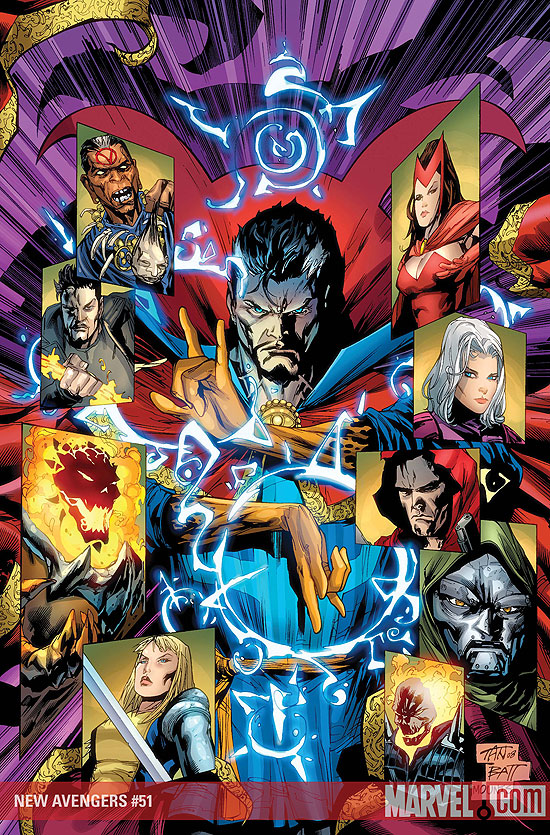 Nous ouvrons le bal avec le New Avengers #51, avec au scénario Bendis et dessin Chris Bachallo et Billy Tan. Cet épisode débute un nouvel arc avec le Dr Strange, le magicien déchu qui doit passer le flambeau à la jeunesse talentueuse qui s'illustre chez est Wicann des Young Avengers. Les passages avec le doc sont magnifiquement orchestrés par Bachallo. Côté scénario Bendis fait enfin bouger les choses, The Hood veut devenir le sorcier suprême mais pour cela il doit tuer le doc autant dire qu'il est dans la m****, les nouveaux vengeurs quant à eux sont en pleine crise interne. Mockinbird pense que Ronin n'aurait pas du faire cette intervention télévisé et Spider-Man semble jouer les solitaires...Assez bon épisode dans l'ensemble qui s'éloigne un petit peu du Dark Reign ...